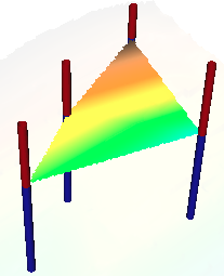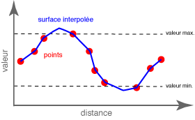 La surface interpolée va passer par les points d'origine, mais les crêtes et les creux peuvent s'étendre au-delà de la valeur maximale et de la valeurs minimale de la variable utilisée.
