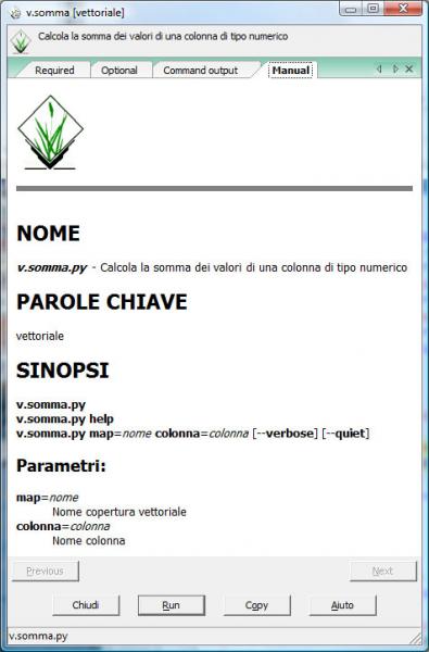 - Progammazione & GIS, en italien qui explique de manière très détaillée comment créer des modules en Python, ce qui m'a permis de démarrer (modules en Python v.somma.py, v.elimina.py, v.test.colonna.py, v.quota.py, tin_to_raster.py, tin.hmed.basin.py, tin.lago.py, avec, en particulier la création des fichiers d'aide)