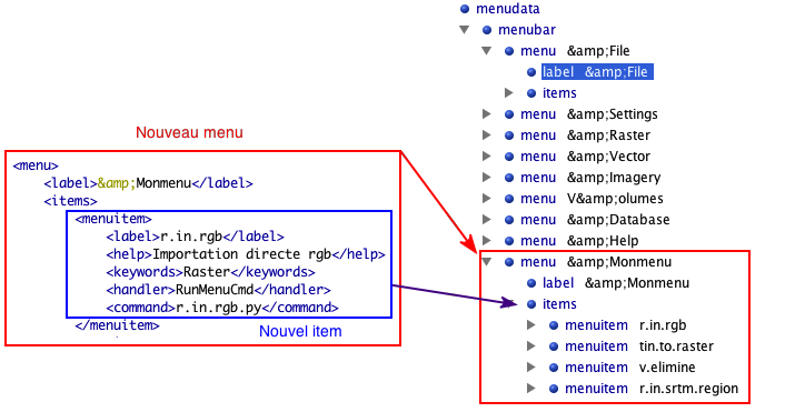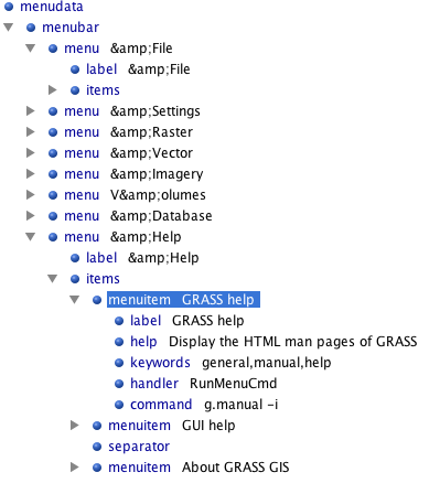 L'interface de GRASS GIS est programmée en wxPython. Avec wxPython, les menus sont codés dans un seul fichier xml nommé menudata.xml situé dans le répertoire d'installation de GRASS/etc/wxpython/xml/menudata.xml (/Applications/GRASS-6.4.app/Contents/MacOS/etc/wxpython/xml/menudata.xml pour Mac OS X). C'est un fichier xml dont la structure est la suivante: