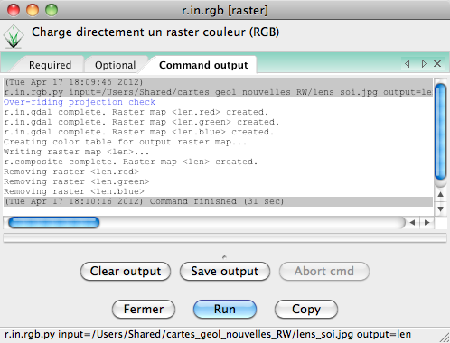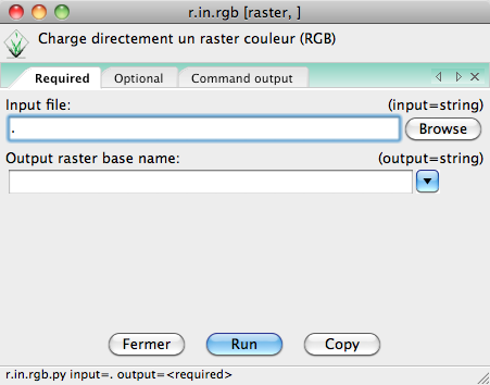 Notons aussi que www.ing.unitn.it/~grass/software.html propose un autre script plus ancien, nommé aussi r.in.rgb, non écrit en Python, dont le but est de traiter tous les fichiers d'un répertoire avec en plus, l'utilisation de r.patch pour tous les fusionner en une méga couche.