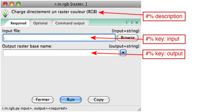 options, flags = grass.parser()Il y a 2 champs options: