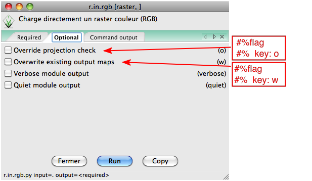 drapeau = flags['o'] # -> renvoie vrai ou faux selon que la case est cochée ou nonif drapeau:drap = 'o'grass.run_command('r.in.gdal',flags=drap,input=entree, output=sortie)else:grass.run_command('r.in.gdal',input=entree, output=sortie)