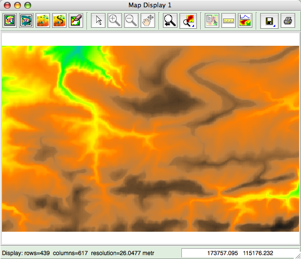 GRASS 6.4.0RC5 (geol):~ > r.info map=elev.ok@moi +----------------------------------------------------------------------------+ | Layer: elev.ok@moi Date: Sat Mar 20 13:11:01 2010 | | Mapset: moi Login of Creator: yo | | Location: geol | |[....] | | Type of Map: raster Number of Categories: 255 | | Data Type: FCELL | | Rows: 168 | | Columns: 269 | | Total Cells: 45192 | | Projection: Lambert Conformal Conic | | N: 118202.17276904 S: 108164.99 Res: 59.74513553 | | E: 178054.96845757 W: 161983.527 Res: 59.74513553 | | Range of data: min = -148.065659 max = 262.488892 | [....] GRASS 6.4.0RC5 (geol):~ >