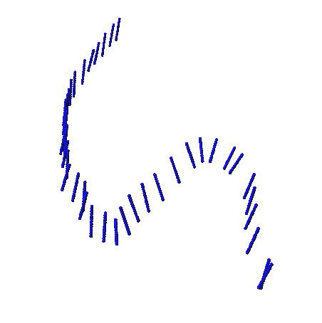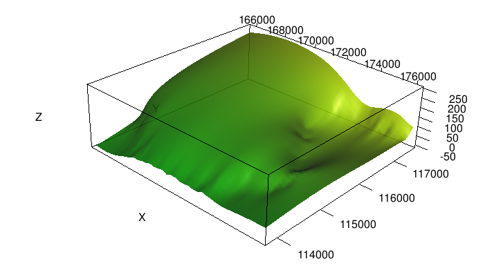 Visualisation avec Nviz (exagération verticale x3). Il faut rappeler, dans le cas présent, que le traitement avec v.surf.rst a été optimisé pour que la surface obtenue "colle" véritablement aux points traités alors que le krigeage est brut. La surface doit encore être "nettoyée" avec r.mapcalc pour obtenir celle limitée aux points.