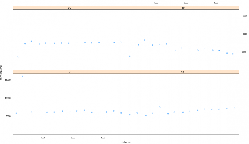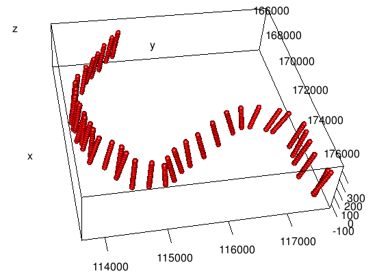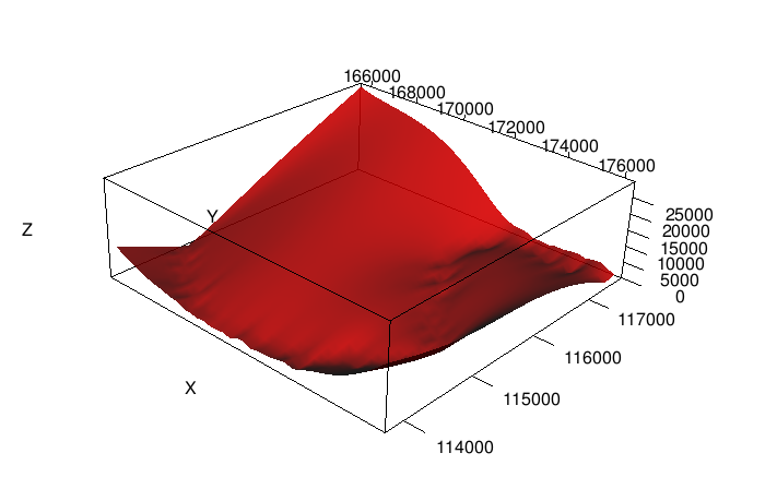 Nous allons utiliser le principe précédent pour faire une interpolation 3D par krigeage ordinaire à l'aide d'un des packages, gstat, en appliquant les traitements proposés par casoilresource.lawr.ucdavis.edu/drupal/node/438 ou blog.andrewl.net/articles/2008/05/02/digging-kriging.