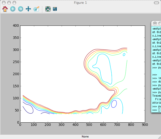 même traitement (ici, traitement brut, sans projection et sans définir d'intervalle, contrairement à r.contour) avec Scipy et Matplotlib (à droite le shell Grass)