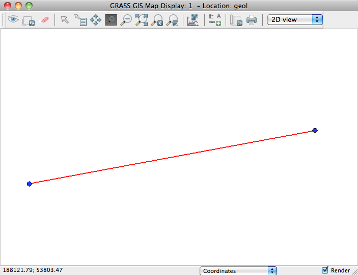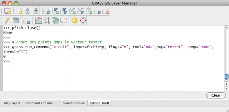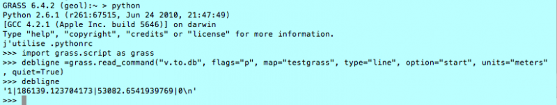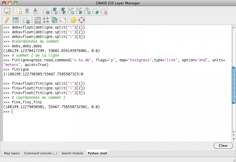 """coordonnées du premier sommet""" debligne =grass.read_command("v.to.db", flags="p", map="testgrass", type="line", option="start", units="meters" , quiet=True) debx=float(debligne.split("|")[1]) deby=float(debligne.split("|")[2]) debz=float(debligne.split("|")[3]) """coordonnées du deuxième sommet""" finligne=grass.read_command("v.to.db", flags="p", map="testgrass",type="line", option="end", units="meters", quiet=True) finx=float(finligne.split("|")[1]) finy=float(finligne.split("|")[2]) finz=float(finligne.split("|")[3]) """création d'une couche vide testpt""" grass.read_command("v.edit",tool="create",map="testpt") """création d'un fichier temporaire au format standard: P 1 1 186139.12370417 53082.65419398 1 1 P 1 1 188199.1227985 53467.75855873 1 2""" fichtemp = grass.tempfile() pfich = open(fichtemp, 'w') print>> pfich, "P", "1", "1" print>> pfich, debx, deby, debz print>> pfich, "1", 1 print>> pfich, "P", "1", "1" print>> pfich, finx, finy, finz print>> pfich, "1", 2 pfich.close() """importation des points dans la couche testpt""" grass.run_command("v.edit", input=fichtemp, flags="n", tool="add",map="testpt", snap="node", thresh="1")