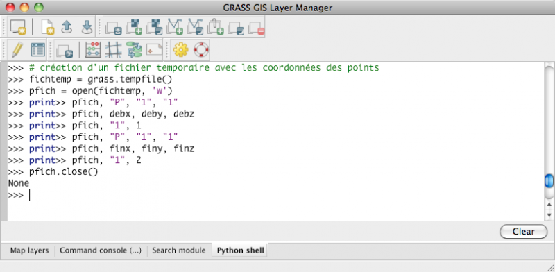 - puis un fichier temporaire GRASS (grass.tempfile()) pour enregistrer ces points au format standard: