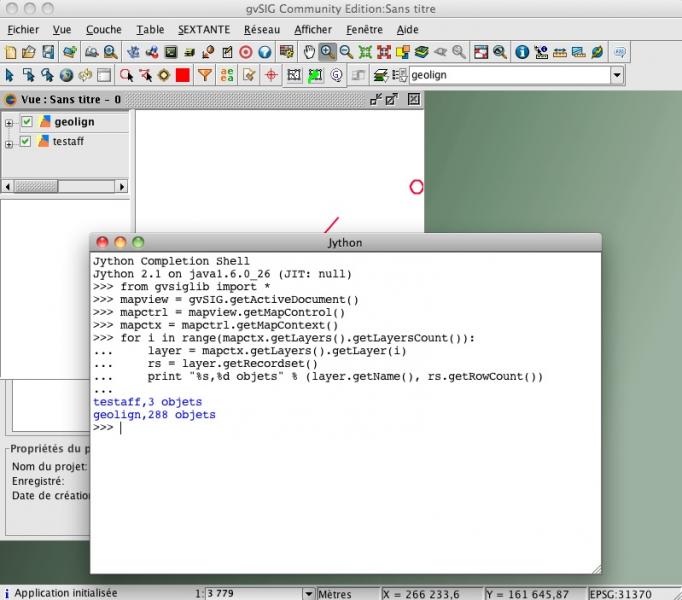 - avec la future version 2.0, c'est le nouveau module gvsig, beaucoup plus « pythonesque » (traduction libre de "pythonic") mais il faut, pour l'utiliser, télécharger la dernière version disponible (www.gvsig.org/web/projects/gvsig-desktop/devel/gvsig/2_0_0/version) et installer l'extension Scripting Framework. Il y a des versions pour Linux et Windows, mais rien pour Mac OS X pour l'instant. Patience, Agustín Diez Castillo (gvsigmac.blogspot.be/ ) y travaille (communication personnelle).