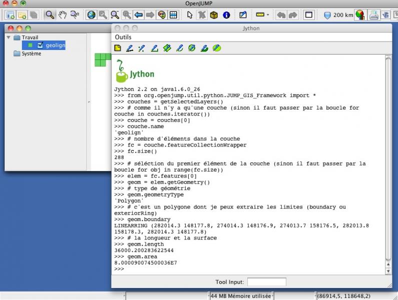 Le nouveau module gvsig de la version 2 de gvSIG parait néanmoins se rapprocher beaucoup plus d'une version Python (sans devoir connaître le détail des classes Java dont il dépend). Et finalement j'ai été fort impressionné par les possibilités du module d'OpenJump (logiciel à mon avis sous-évalué).
