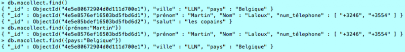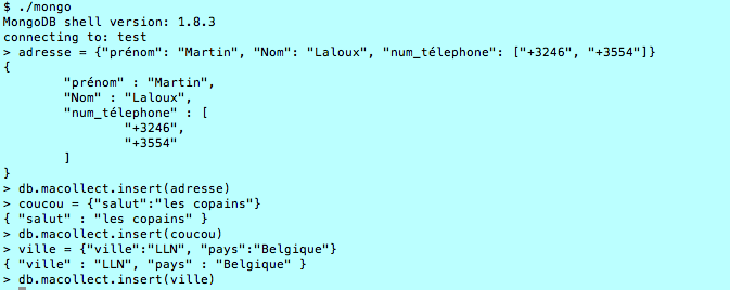 Ici, je crée les nouveaux éléments puis je les insère dans la collection macollect. Tout est ensuite fait automatiquement par MongoDB (création, indexation, etc.). Il y a aussi les commandes delete, upgrade,etc. (komunitasweb.com/2011/06/mongodb-basic-operations/)
