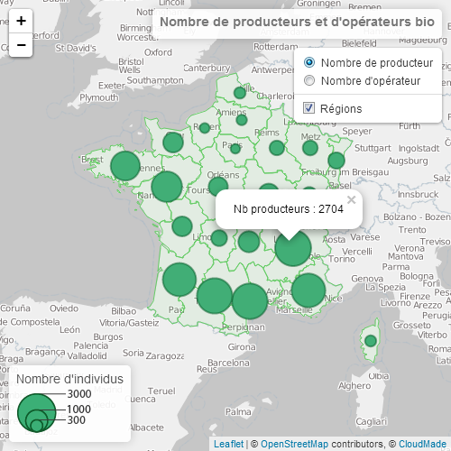 L’objectif de ce tutoriel est de créer une carte en ligne qui présente le nombre de producteurs bio et le nombre d’opérateurs bio (transformateurs, vendeurs) par région. Nous verrons donc :