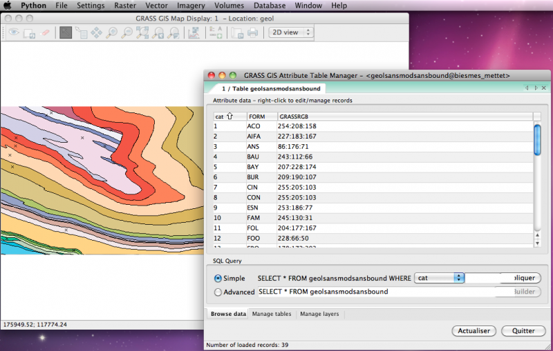 - L'extension-librairie Sextante (forge.osor.eu/plugins/wiki/index.php) permet d'utiliser tous les algorithmes de GRASS. Le langage de script est Jython (implémentation Java de Python). Il est possible d'afficher les couches suivantes: