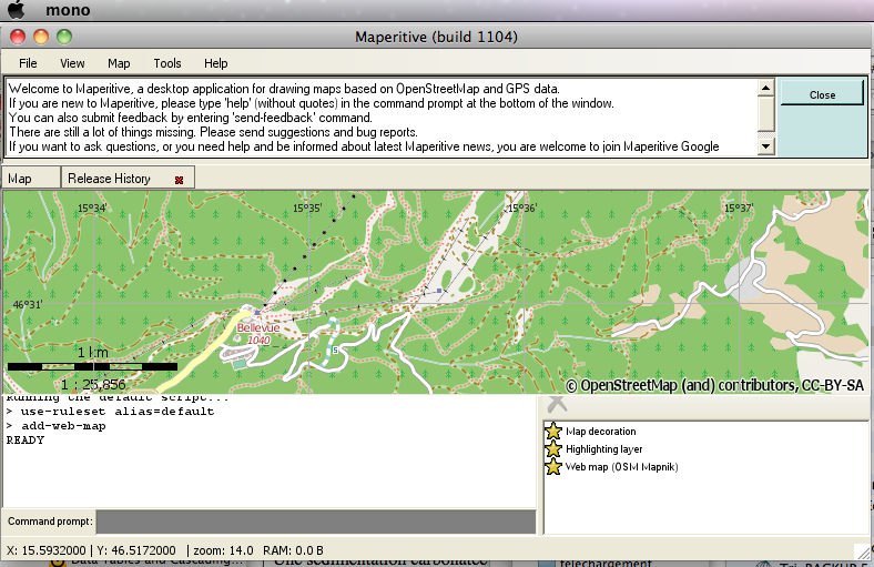 - en utilisant Mono, implémentation Open Source de la plateforme .NET (mono-project.com/). Ainsi Maperitive (maperitive.net/) qui permet de tracer des cartes assez sophistiquées à partir des données d'OpenStreetMap.