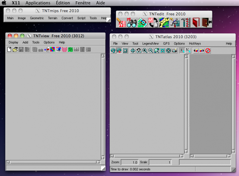 - www.microimages.com/tntlite/ offre une version gratuite de TntMips Pro, mais limitée dans le nombre d'objets spatiaux qu'il est possible de traiter. C'est un SIG très puissant, difficile à appréhender de prime abord et dont l'interface est spéciale (utilise X11) et très loin d'être « Macosienne »...
