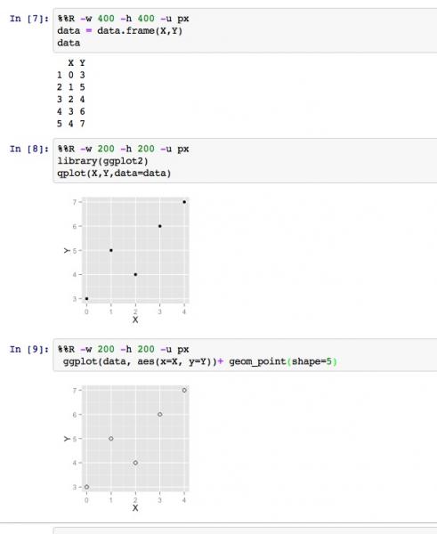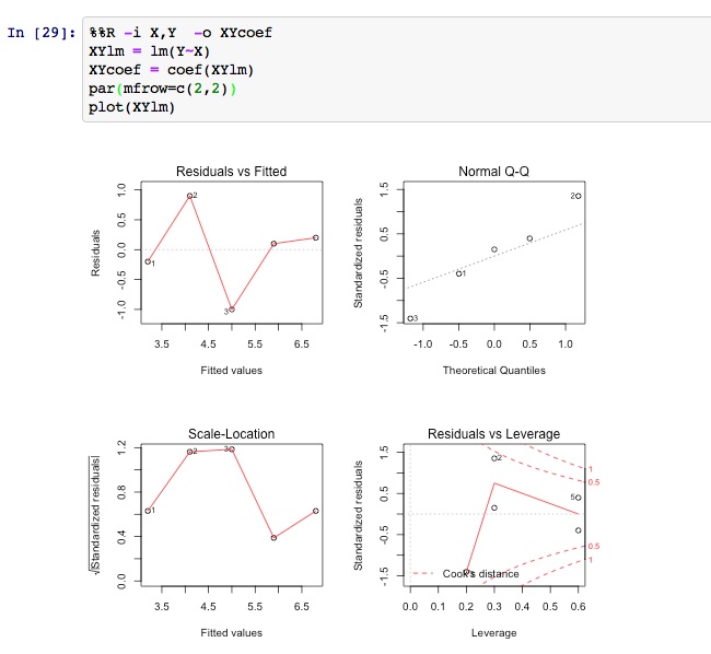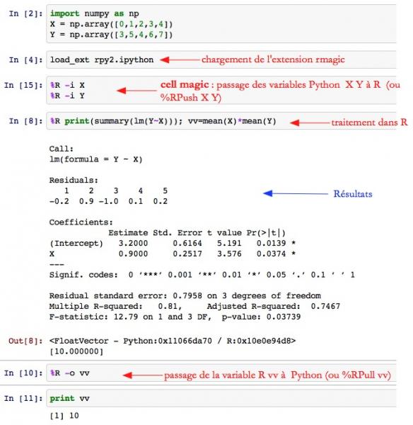 - utiliser d'autres programmes dans le Notebook, comme rmagic qui permet d'utiliser R dans le Notebook en utilisant les variables X,Y précédemment définies, mais il y en a des dizaines d'autres (Ruby, Julia, C, Fortran, MatLab, Octave, JavaScript, GraphViz, etc., voir Extension Index) et il s'en crée des nouvelles régulièrement. Ce sont les cell-magics. Il faut bien évidemment que ces applications tierces soient préalablement installées.