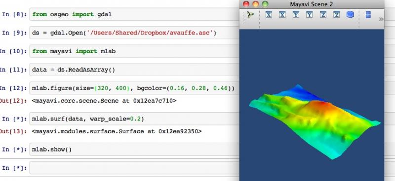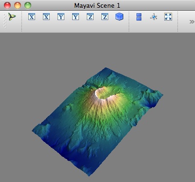 - visualizing Mnt Saint Helens (avec la représentation obtenue avec le module Mayavi non visible dans le Notebook car la fenêtre est extérieure), en complément de How much rock was erupted from Mt St Helens?