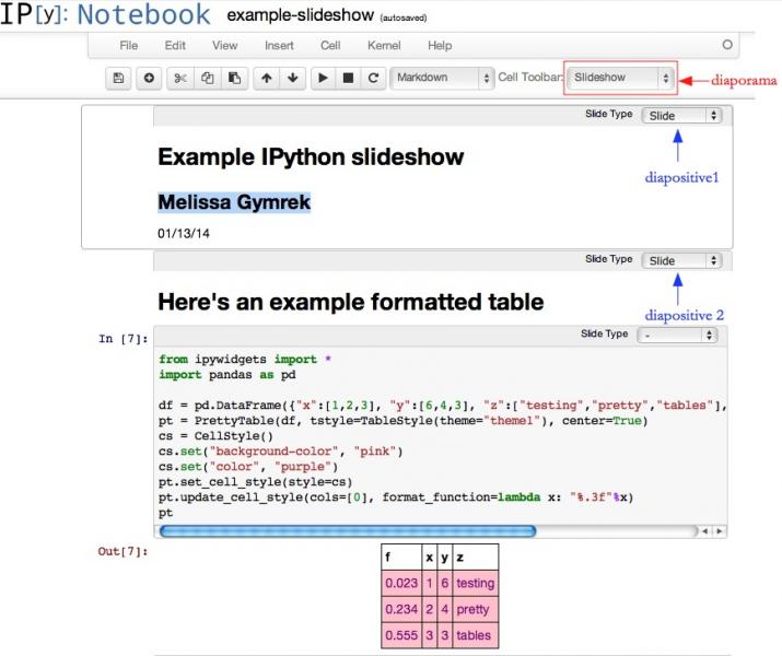 Il est aussi possible de créer des diapositives (slides) de présentation (SlideShow) avec l'API JavaScript reveal.js, (voir IPython Slideshows Will Change the Way You Work).