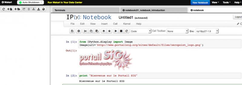 Seules les cellules au format Code peuvent être exécutées comme dans un shell classique (avec les touches Majuscule + Return, out() dans la figure suivante et il existe de nombreuses autres astuces), les autres servent à entrer des notes (format Markdown):