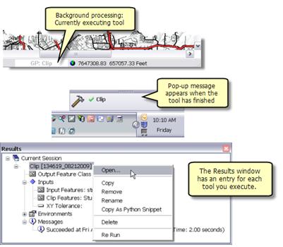 Fenêtre pop-up de géotraitement : Chaque géotraitement effectué faisait apparaître avec la 9.3.1 une fenêtre qui permettait de suivre le processus en cours et de connaître les résultats du traitement. Désormais, cette fenêtre ne se voit plus : elle est en arrière plan. Il y a en bas à droite le message du traitement en cours, et un pop-up à la fin du traitement. En cliquant dessus, il permet d’observer les résultats mais aussi, les résultats des sessions précédentes (nouveauté ArcGIS 10).
