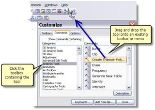 Nouveau menu « Géotraitement » qui possède des outils par défaut identiques à ceux les plus utilisés de l’ArcToolBox (Extraction, buffer etc…). Ce menu peut subir des changements au bon grès des utilisateurs en supprimant ou en ajoutant des outils de l’ArcToolBox. Avec la version 9.3.1, on pouvait construire ou changer des barres d’outils avec des outils de la fenêtre personnaliser, ESRI a ajouté dans cette fenêtre les outils de l’ArcToolBox en plus des dll : les utilisateurs ont une plus grande palette de choix de personnalisation de l’interface.