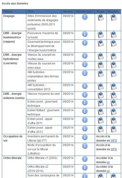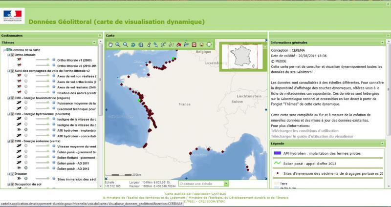 - une carte dynamique de visualisation (Cartélie) contenant toutes les données de Géolittoral à l'échelle de la métropole (Orthophotographie littorale, éolien, hydrolien, sentier du littoral, risque,...) ainsi que des liens vers leurs métadonnées (Géocatalogue).