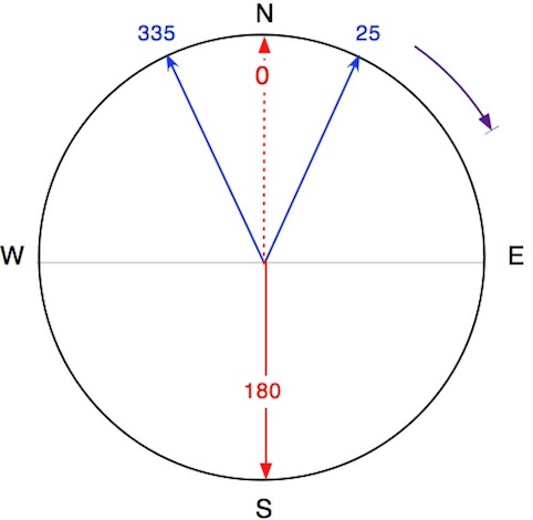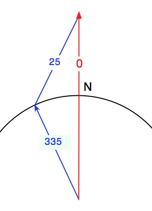 Prenons le simple cas d'un calcul de moyenne entre 2 azimuts de 335° et 25° avec le 0° situé au Nord.