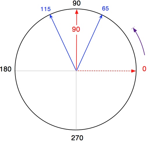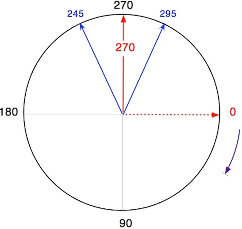 La réponse obtenue par les méthodes traditionnelles est de 180° ce qui n'est clairement pas ce à quoi on s'attend logiquement (la réponse attendue serait obtenue en réécrivant 335° comme -25°). Si la valeur d'origine (0°) est placée à l'Est (canevas mathématique) et qu'une rotation horaire est utilisée, les valeurs d'azimut deviennent 245° et 295° et le résultat sera la réponse attendue de 270°. Il en va de même avec une rotation antihoraire (90°).