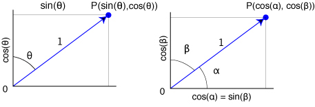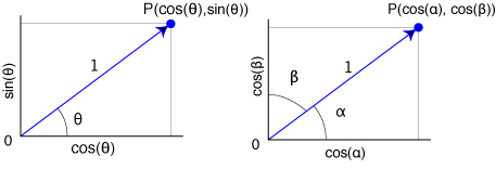 Une fois que l'origine (0°) et le sens de rotation (horaire ou antihoraire) ont été fixés, il est facile de les transformer en 2 (ou 3) coordonnées suivant les divers critères illustrés ci-dessous (l'important est de conserver les mêmes critères tout le long du processus). Tous les calculs se font sur ces coordonnées et non sur la valeur angulaire.