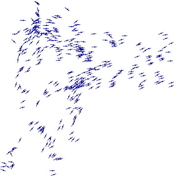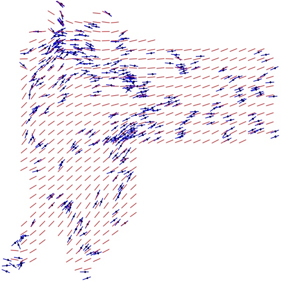 D'un point de vue algorithmique une solution que j'ai trouvé est de tester chacune des directions (0 à 359°) . Pour chaque direction je calcule la somme du produit scalaire de chaque point (ayant un angle comme propriété) du voisinage avec celui de la direction testée. On peut ajouter des paramètres de pondération (fonction de la distance par exemple) et on retient l'angle ayant la somme maximum qui est donc la direction privilégiée