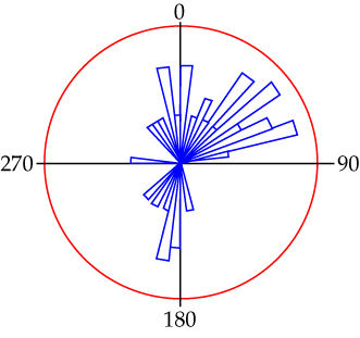 Elles représentent un autre type de problème. Elles sont différentes des données circulaires s.s. du fait que l'angle et l'angle + 180° représentent la même orientation (de plus, l'intervalle 180° est choisi arbitrairement). Comme déjà dit, n'étant pas circulaires, elles pourraient être traitées comme des données linéaires, mais depuis Mardia (1972), l'approche standard est de doubler les angles (modulo 360°, c'est à dire que pour une valeur de 340° -> 680° -> 680° - 360° = 320° alors que 140° -> 280° ) et obtenir ainsi des données circulaires similaires aux précédentes. Les résultats finaux seront ajustés en conséquence (direction moyenne / 2, par exemple. En fait, cette méthode a été proposée dès 1939 par W.C. Krumbein dans Preferred orientation of pebbles in sedimentary deposits. Journal of Sedimentary Petrology, 47, 673-706).