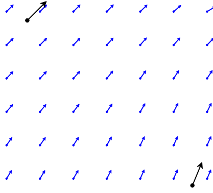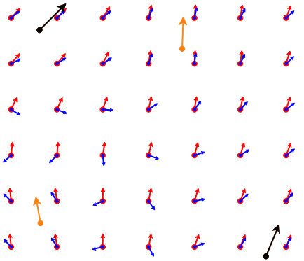 Les flèches bleues sont le résultat de l'interpolation effectuée directement sur les valeurs angulaires et donnent l'impression de « s'affoler ». Les flèches rouges sont le résultat du traitement effectué avec les méthodes exposées ci-dessus pour les données circulaires et le résultat se passe de commentaires. J'ai aussi utilisé un tel type de traitement dans Trajectoires_de_schistosité (IPython Notebook) et ça marche, puisque j'ai pris soin de limiter l'intervalle des données axiales.