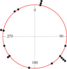- que les valeurs sont circulaires (et non linéaires), c'est-à-dire qu'elles se distribuent sur un cercle avec des valeurs comprises entre 0 et 360°, les valeurs 0° et 360° étant équivalentes (périodicité des mesures). Cela va compliquer beaucoup de choses comme le calcul d'interpolations, par exemple;