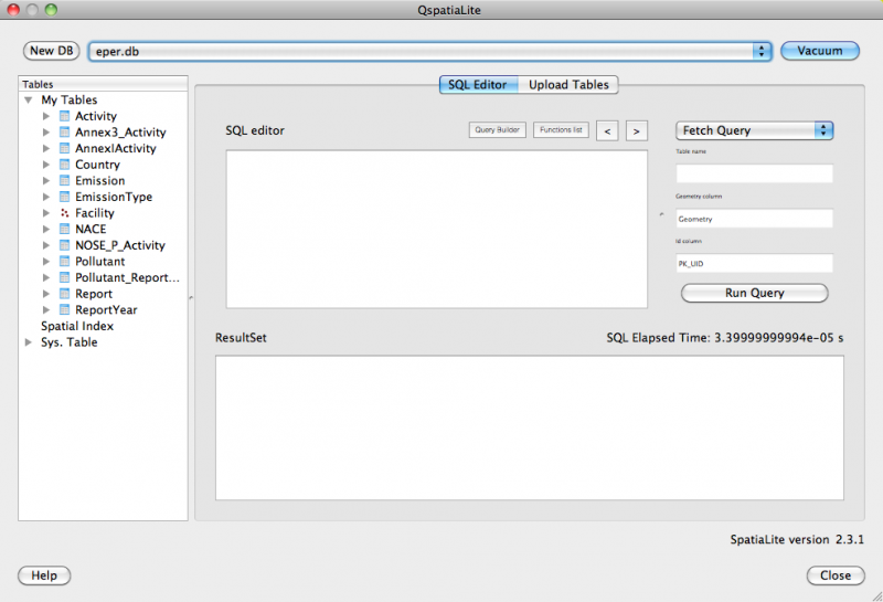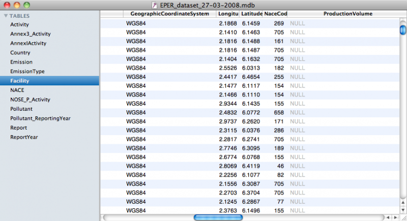 Plus intéressante est la démarche de Barry Rowlingson (geospaced.blogspot.com/2009/12/converting-mdb-to-spatialite.html) qui montre comment transformer une base Access provenant de l'Agence Européenne pour l'Environnement ( www.eea.europa.eu/) en base SpatiaLite. Il s'agit de la base du Registre européen des émissions de polluants (EPER) disponible à www.eea.europa.eu/data-and-maps/data/eper-the-european-pollutant-emission-register-3 au format Microsoft Access (eper_dataset_27-03-2008.zip)