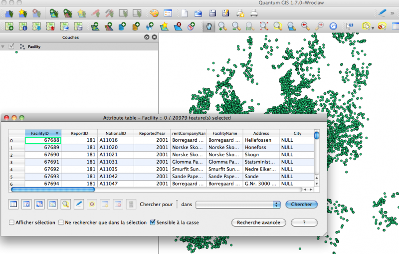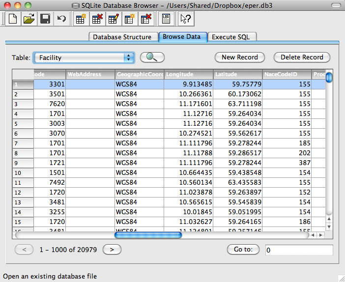 L'examen de la base montre qu'au moins une table avec des colonnes longitude, latitude et Système de coordonnées (WGS 84) existe, la table Facility :
