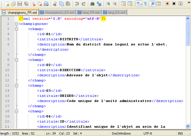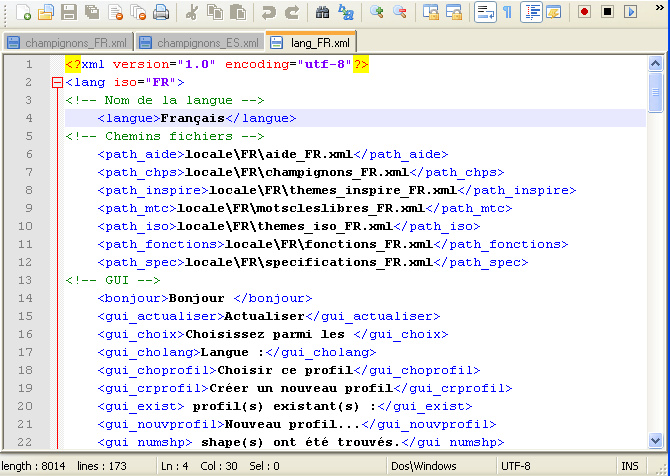 Aperçu du fichier XML des textes du programme : lang_FR.xml