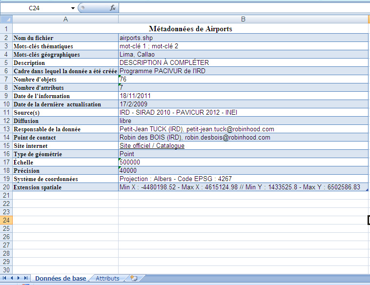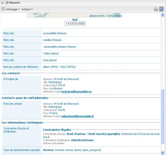 • exporter les fiches en 4 formats : html, Word 2003/2007 (.doc/.docx), Excel 2003 (.xls) et XML ISO19139 (en partie seulement) importable dans un outil de catalogage comme GéoSource.