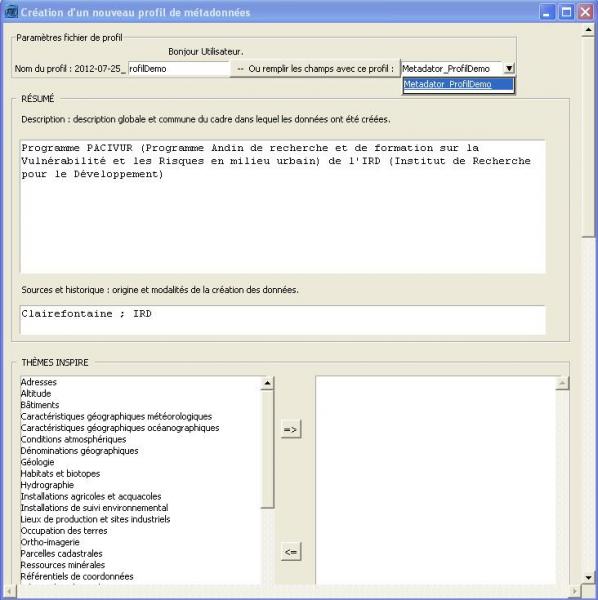 Metadator repose sur l'application de profils de métadonnées à un ou plusieurs shapefiles, en considérant que bien souvent les parties descriptives des métadonnées (résumé, sources, contacts, mots-clés, ...) sont communes à plusieurs données. Metadator permet de créer ces profils via un formulaire (qui rappelle celui d'Expire). L'utilisateur peut ainsi créer un nombre infini de profils applicables à des lots de shapes plus ou moins nombreux.