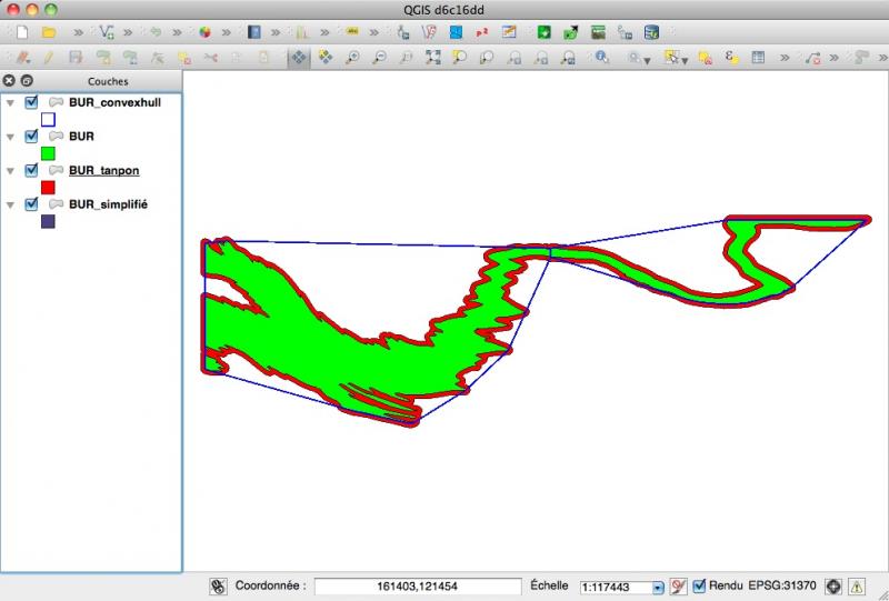 A titre de démonstration, nous allons appliquer plusieurs traitements à une même couche (simplification, zone tampon, enveloppe convexe (Convex hull):