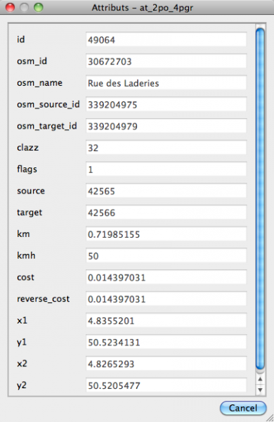 Les attributs permettent de voir les éléments du graphe topologique, les arcs (source et target) ainsi que les poids du graphe valué (cost), entre autre choses :