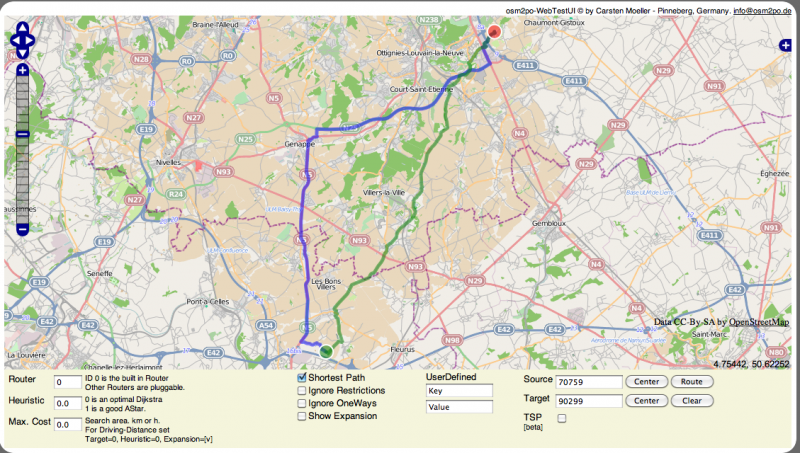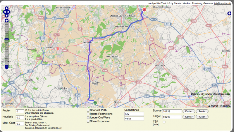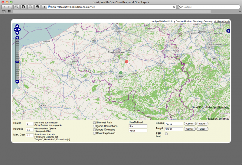 L'ouverture de cette URL offre l'interface de traitement qui permet d'effectuer divers calculs d'itinéraires en déplaçant les points noir (en théorie, mais vert dans mon cas...) et rouge à l'aide de la librairie OpenLayers :