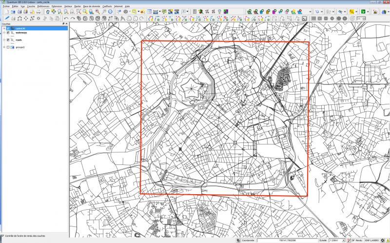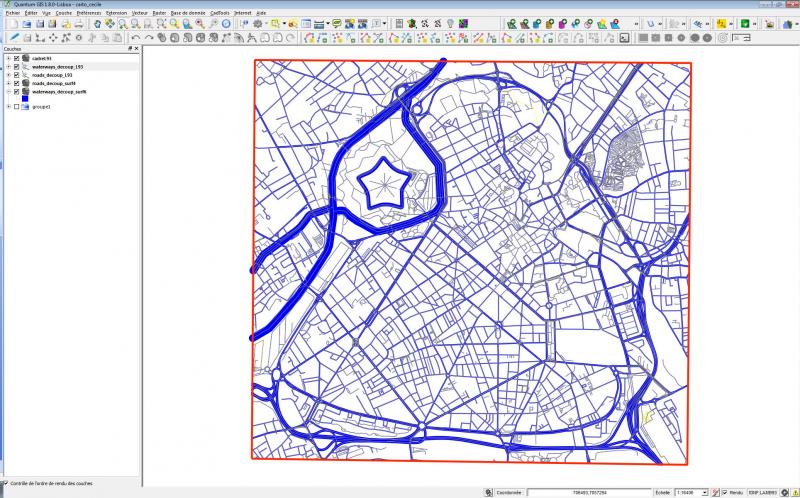 Une fois la reprojection effectuée, attelons-nous à définir le périmètre que nous souhaitons, pour cela il nous faut créer une nouvelle couche "cadre" et découper nos couches "voiries" et "cours d’eau" par ce cadre (dans QGis : menu vecteur -> outil de géotraitement -> découper).