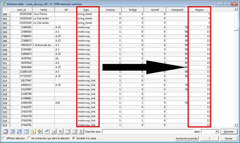 Perso j'avais bossé avec QGis 1.8 du coup il n'y avait pas encore la fonction "conditions/case" dans la calculatrice de champs. J'aurai pu le faire avec le plugin Field Pyculator mais dans mon cas, j'avais attribué les largeur type par type en sélectionnant toutes les voies que je voulais mettre avec une largeur de x mètres, puis toutes les voies à y mètres etc...