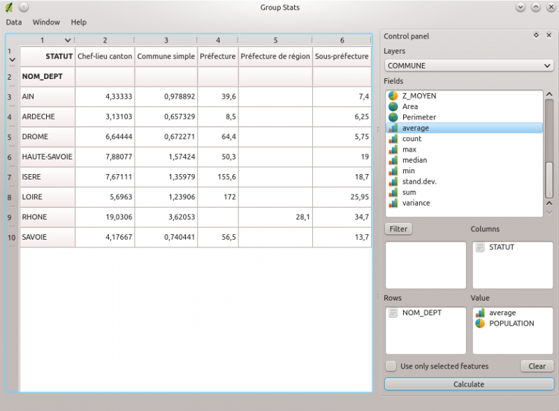Le plugin Group Stats peut nous permettre de calculer la moyenne de la population de chaque type de statut ci dessus, en fonction de leur département d'appartenance :
