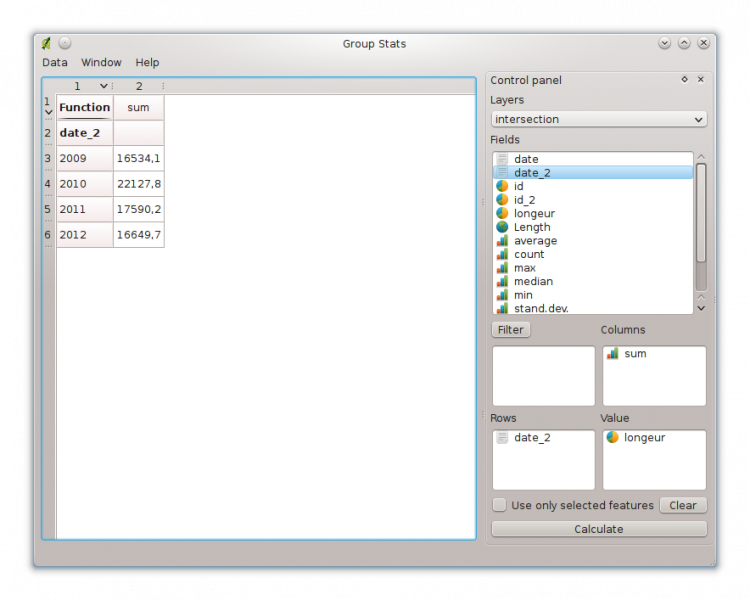 Une fois que nos lignes sont découpées en tronçons individualisés, le plugin Group Stats nous permet aisément de calculer la somme des longueurs des différents tronçons en fonction de l'année de recensement.