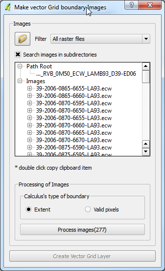 Il faut pointer sur le répertoire contenant les images puis lancer "Process images". On peut ensuite lancer "Create Vector Grid Layer" qui génère la couche de polygones.