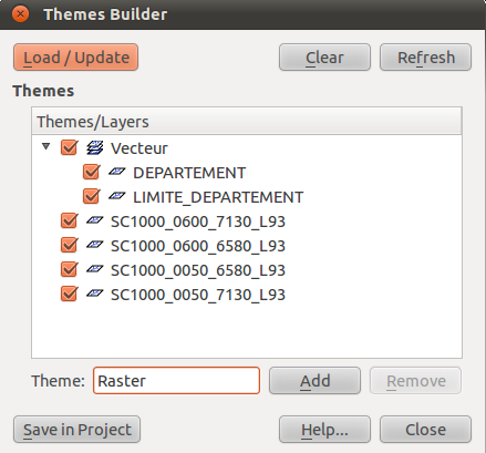 Vous pouvez sauvegarder ces différents thèmes dans votre projet QGIS à l'aide du bouton Save in Project. A la prochaine ouverture du projet QGIS, vos thèmes se retrouveront dans le plugin Map Themes Builder.