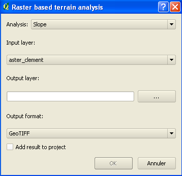 Une fois correctement installé, vous pouvez accéder à cette extension à partir du menu Extension / Raster based terrain analysis … / Raster based terrain analysis ... (à noter que ce plugin ne semble pas actuellement dans un dépot QGIS)