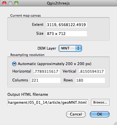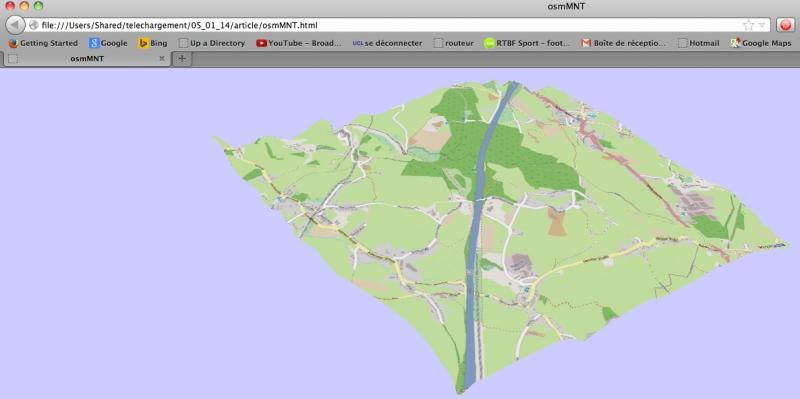 Tous les traitements ont été réalisés sur Mac OS X avec QGIS 2.0 Dufour et une version de QGIS master (2.1) avec une version modifiée du script qgis2threejs.py pour qu'il fonctionne sur Mac OS X (voir ma réponse sur Qgis2threejs suggestions....).