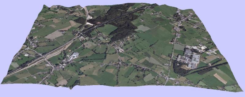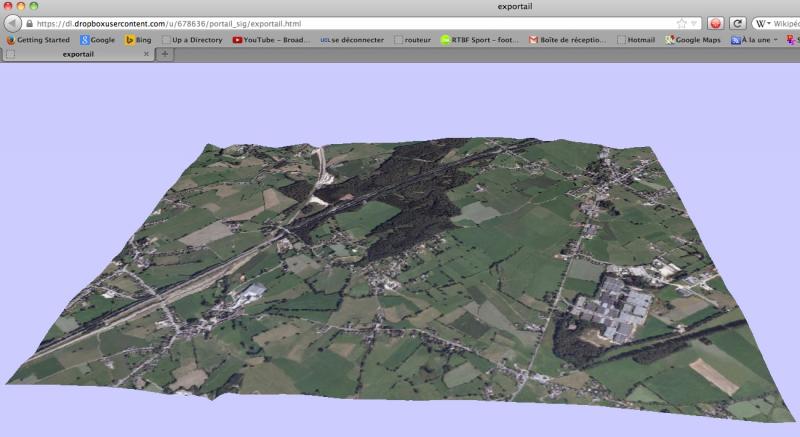 - l'exemple montré en introduction utilise un MNT et une couche WMS (afficher exemple pour le Portail SIG, attention, il vous faut un navigateur qui supporte le WebGL. Dans mon cas, ça marche très bien avec Firefox et il faut lui laisser un certain temps):